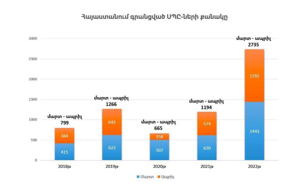 2022 թվականի մարտ-ապրիլ ամիսների ընթացքում Հայաստանում գրանցվել է 2735 ՍՊԸ։ Այդ ընկերություններից 1443-ը գրանցվել են մարտին, 1292-ը՝ ապրիլին։