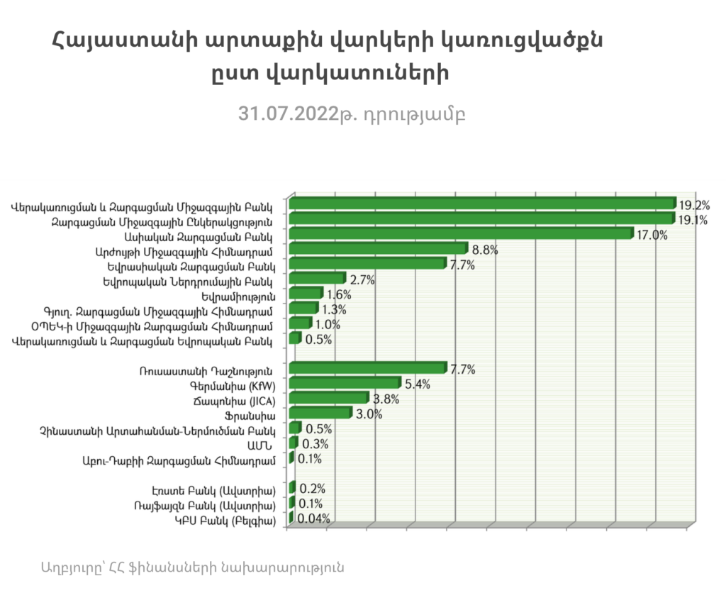 ՀՀ Ֆինանսների նախարարության տվյալները ցույց են տալիս, որ արտաքին վարկերի մոտ 79%֊ը միջազգային կազմակերպություններից ստացված փողերն են, մնացածը՝ օտարկերյա պետություններից ստացված վարկերն ու փոխառություններն են։