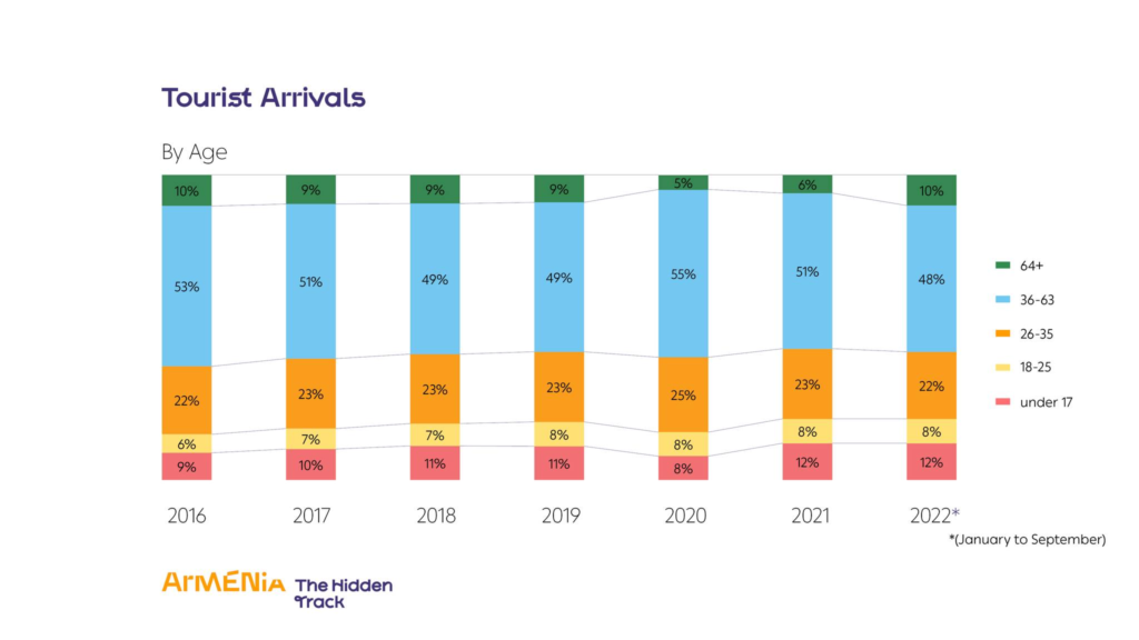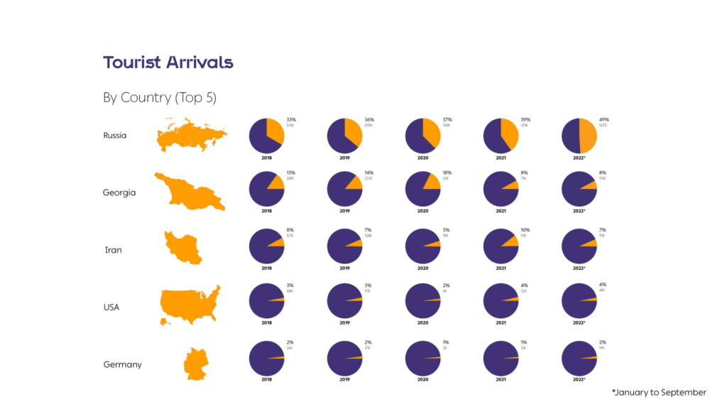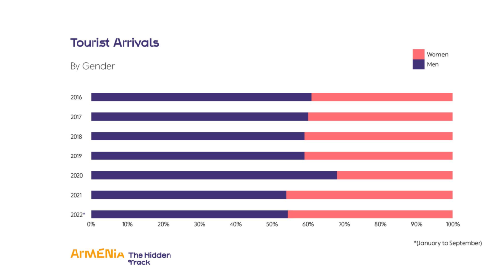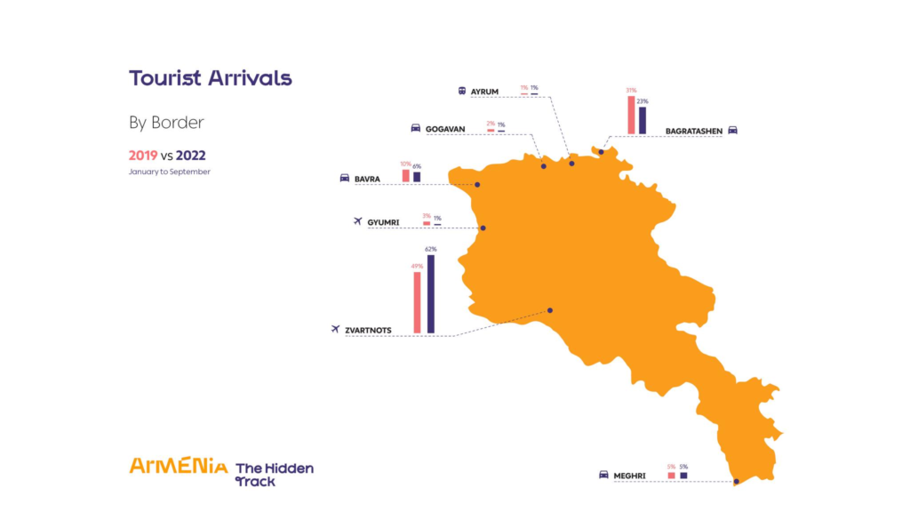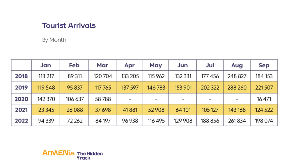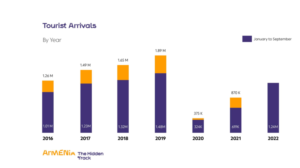 Հատկանշական է, որ ընդհանուր հաշվով մեր երկիրն 2022-ի հունվար-սեպտեմբերին ընդունել է շուրջ 1 միլիոն 240 հազար զբոսաշրջիկի և այս ցուցանիշով զիջում է միայն 2018-ին և 2019-ին: Ընդհանուր առմամբ, այդ տարիներին, մեր երկիր են այցելել համապատասխանաբար 1 միլիոն 650 հազար և 1 միլիոն 890 հազար զբոսաշրջիկ: